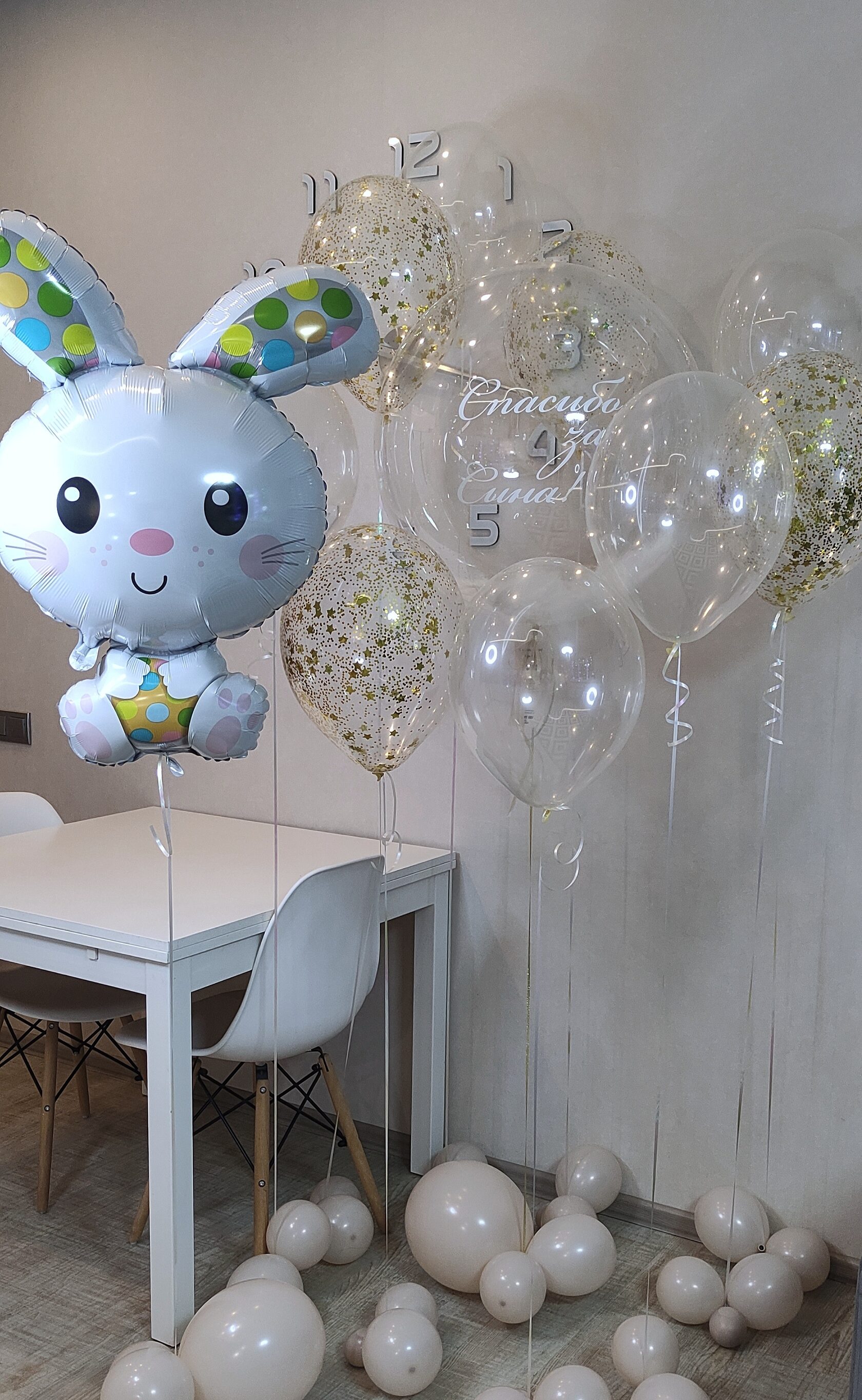 Кристально прозрачные шары 5 шт и шары с конфетти 4 шт , баблс с перышками 60 см- как мыльные пузырики, и милый зайка.